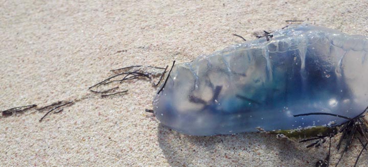 These floating, venomous creatures can be found in Portuguese waters, where their stings are a risk to swimmers. We actually found one washed up on a beach in Wales once and were warned to keep a big distance.